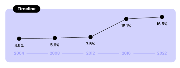 This New Majority includes a diverse range of learners who have been historically underserved by traditional education models including working students, parents and first-generation learners among others. The graph below shows the change in the population of working students between 2004 and 2022.
